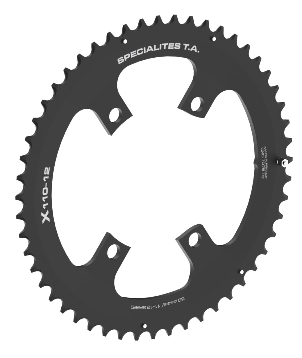 Prato Spécialités TA compatível com transmissões de 12V, o X110 exterior é montado em Pedaleiros Shimano de estrada com BCD 110mm de 4 braços.